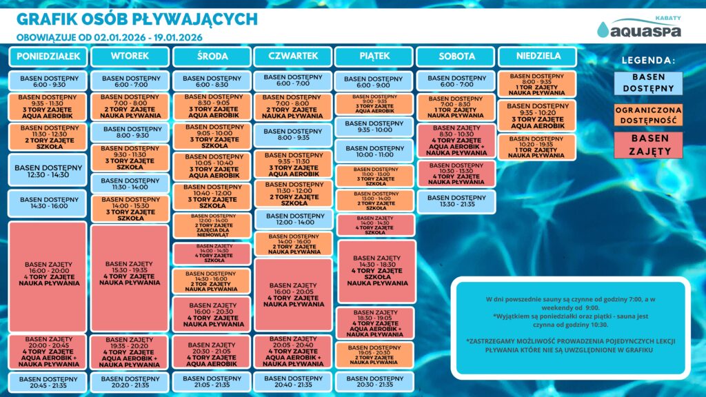 GRAFIK DOSTĘPNOŚCI TORÓW PŁYWACKICH w okresie 02.01.2026 – 19.01.2026