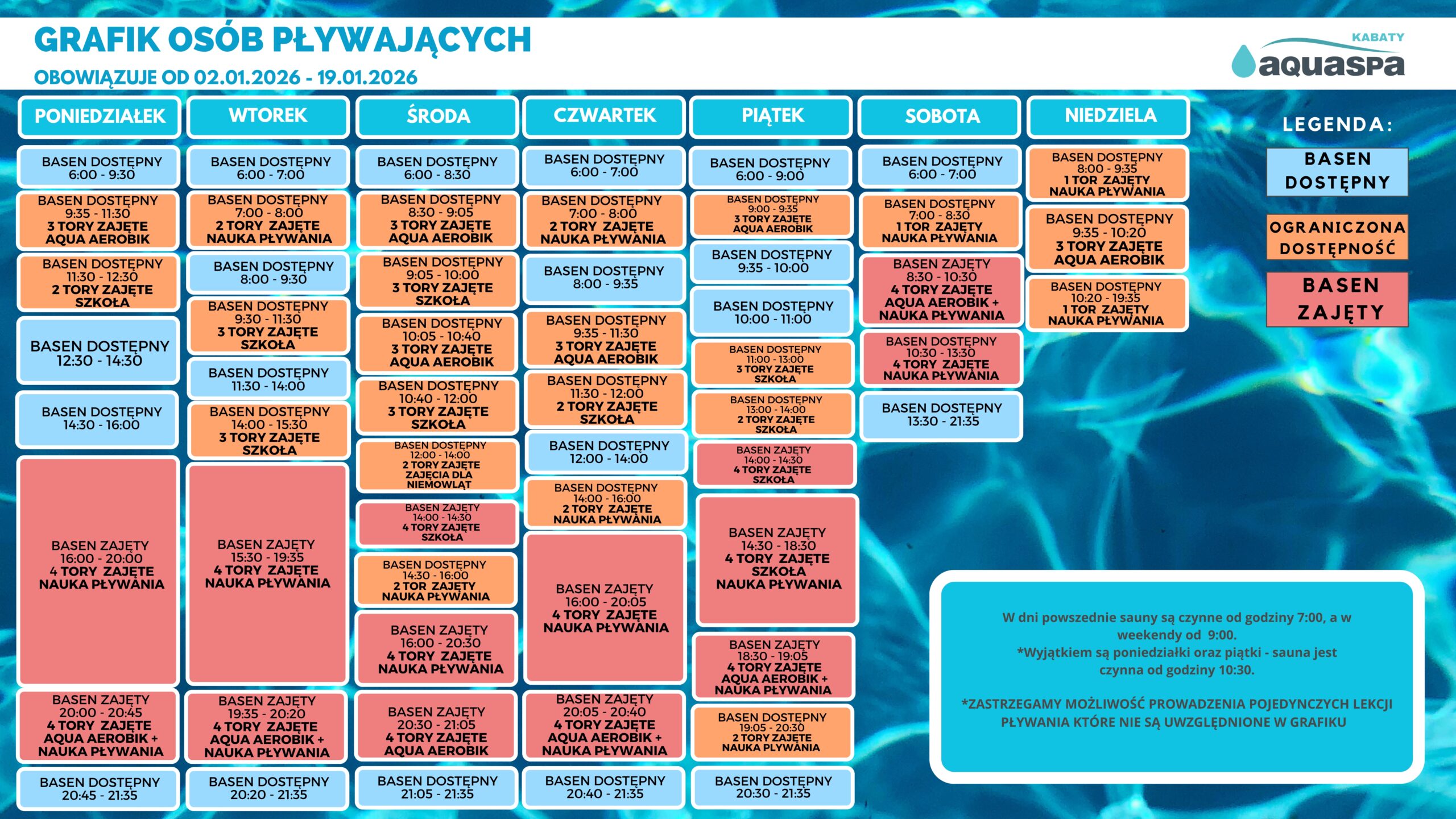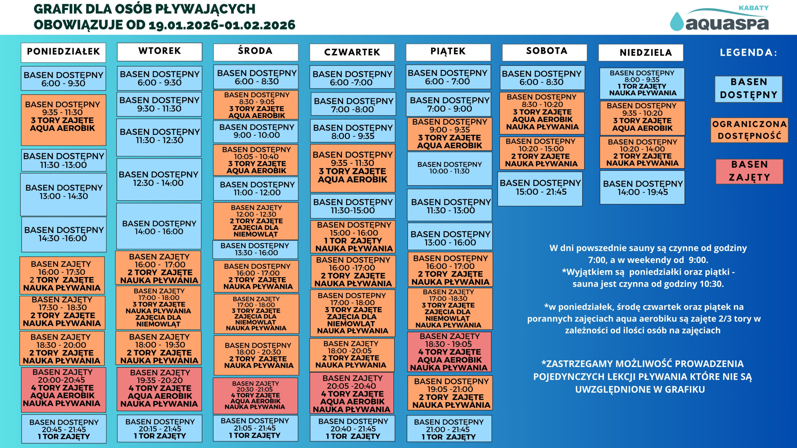 GRAFIK DOSTĘPNOŚCI TORÓW PŁYWACKICH w okresie 19.01.2026 – 01.02.2026